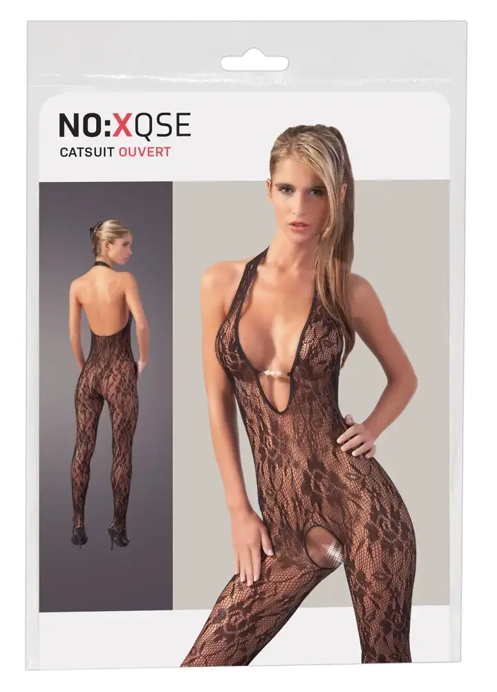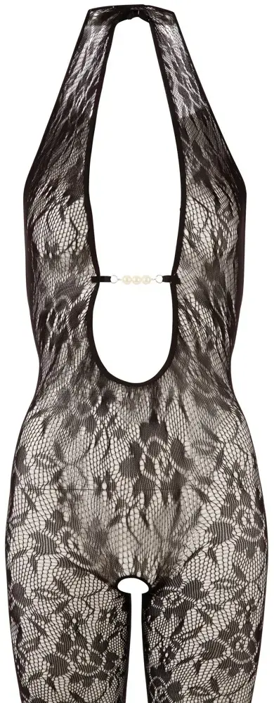 This erotic highlight is a stunning addition to your intimate collection. Crafted from delicate net fabric, this catsuit features a flattering halter neck design and elegant pearl accents in the cleavage area for a sophisticated look.