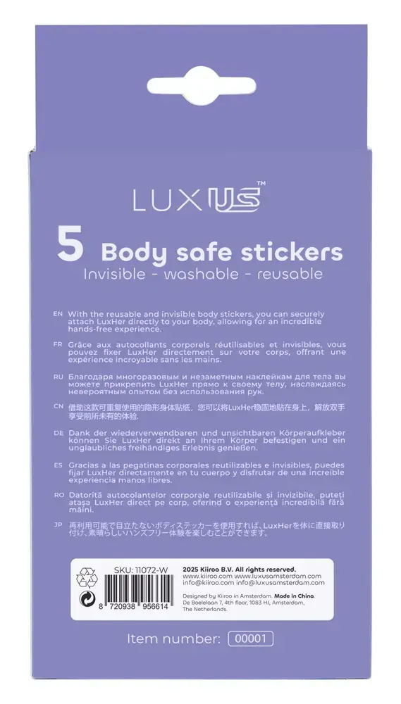 Accessory for the Luxus couple's toy set. The Luxus Adhesive Stickers from Kiiroo make sure that the LuxHer clitoral vibrator from the Luxus couple's toy set stays securely in place – right on the hotspot. The LuxHer vibrator can be stuck to the body (hair should be removed) with one of the adhesive stickers. This sticker will make sure that the vibrator stays securely in any position and that it won't slip off either. The skin-friendly adhesive stickers are reusable. 2 pieces. LuxHer vibrator not included.
