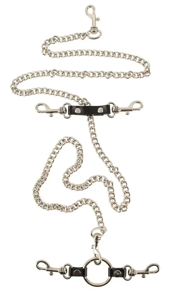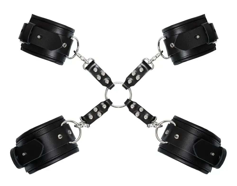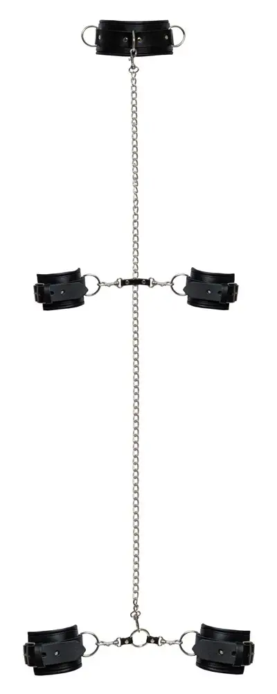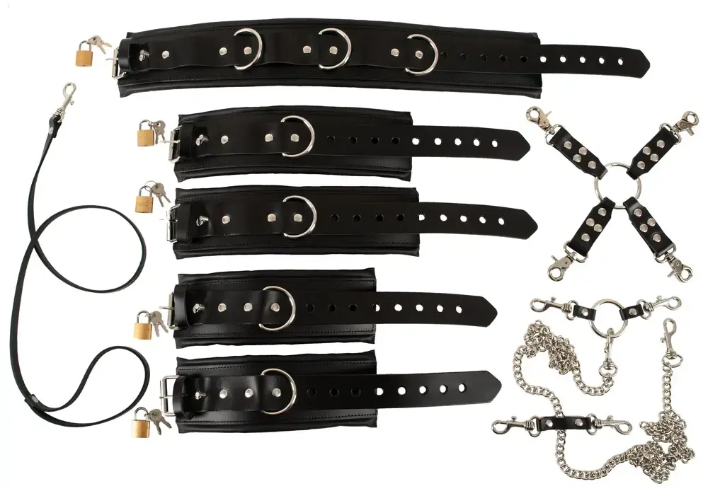 For professional bondage games! The high-quality restraint set from ZADO is made out of black leather and has silver-coloured accessories. The set consists of a collar with a leash, handcuffs, ankle cuffs, a hogtie and a long chain with snap hooks for attaching the restraints. 4 gold-coloured padlocks with keys to lock the handcuffs and ankle cuffs are also included! All of the wide leather restraints are made out of high-quality leather with stitched edges. They also have thick and soft padding which means that they are extremely comfortable to wear. The restraints can be adjusted with the buckle fasteners. They all have sturdy rings for the snap hooks on the hottie or the chain. The connection chain has a snap hook at the top and 2 snap hooks at the bottom as well as a sliding double snap hook. The leash has a snap hook and one end and a wrist loop at the other. Circumference of collar 35–42 cm. Circumference of handcuffs 16–22 cm. Circumference of ankle cuffs 22–28 cm. Leash 97 cm long. Chain 132 cm long. Hogtie 28 x 28 cm. Leather (buffalo, cowhide, lamb – chrome-free tanned), metal.