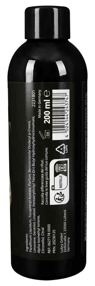 Eļļa nodrošina ilgstošu slīdamību un ir šķīstoša ūdenī, nodrošinot vieglu notīrīšanu un patīkamas sajūtas uz ādas. Lieliski piemērota pāriem, kuri vēlas pievienot romantiku savai ikdienai.