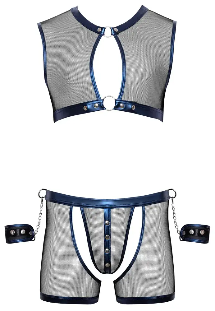 A captivating net look! A short, tight-fitting top, emphasising pants and 2 handcuffs from Svenjoyment Bondage in a set. The set is made out of soft & stretchy transparent black net with beautiful sewn-on metallic blue wetlook material. The silver-coloured studs and rings add striking accents to the set. The top and pants have revealing cut-outs at the front. The pants also have a slit at the back. The 2 included handcuffs can be attached to the top or pants quickly and easily, thanks to their snap hook chains. The soft handcuffs are made out of metallic blue wetlook and can be put on and adjusted very easily, thanks to their hook and loop fasteners. Net 90% polyamide, 10% spandex; wetlook 90% polyester, 10% spandex, polyurethane coating.