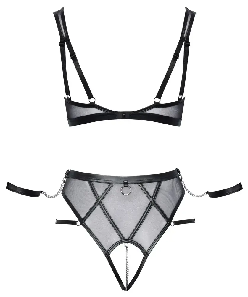 Izbaudiet stilīgu bondage izskatu ar šo vilinošo komplektu no Cottelli BONDAGE. Šī kolekcija, kas paredzēta intīmiem vakariem, apvieno komfortu ar provokatīvu estētiku. Komplektā ietilpst bezvadu krūšturis, augstas jostasvietas biksītes un mīkstas rokudrancas, kas visas izgatavotas no elastīga poliamīda un spandeksa maisījuma, lai nodrošinātu perfektu piegriezumu. Sudraba krāsas aksesuāri un matēta izskata detaļas pastiprina bondage tēmu, padarot to ideāli piemērotu īpašiem gadījumiem vai romantiskām naktīm mājās.