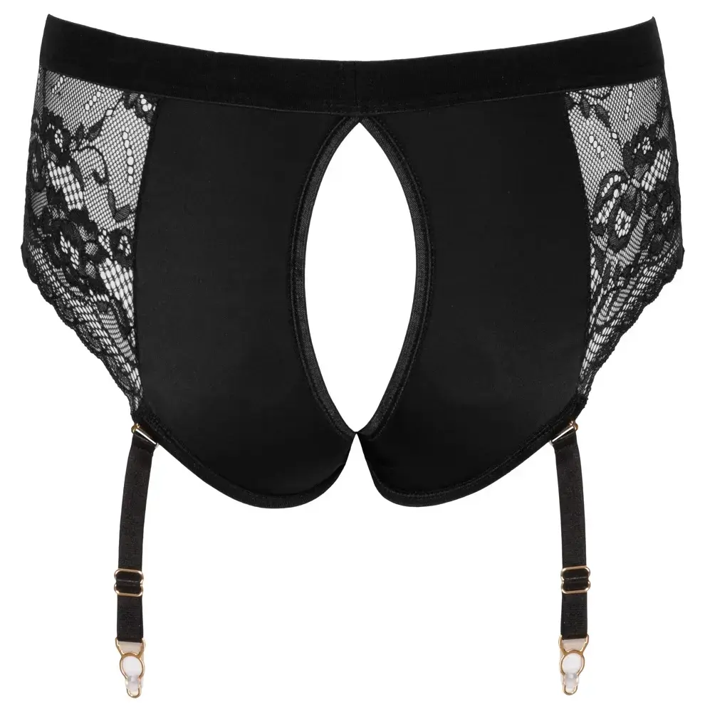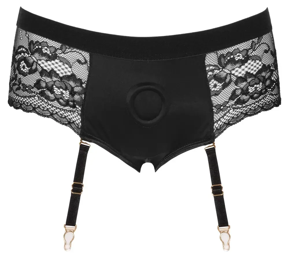 Elegant, comfortable style for thrilling moments! Black strap-on panties from Bad Kitty in a soft, elastic material mix of microfibre and lace. Double-layered at the front with an insert and a carefully incorporated stretchable ring (Ø 3.5 cm) for inserting a dildo/vibrator with a suction base. An inviting cut-out above the bottom. The suspenders are adjustable and also completely removable. 90% polyester, 10% spandex; lace 90% polyamide, 10% spandex. Dildo/vibrator and stockings not included.