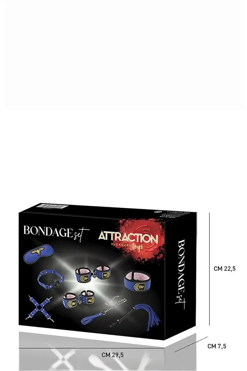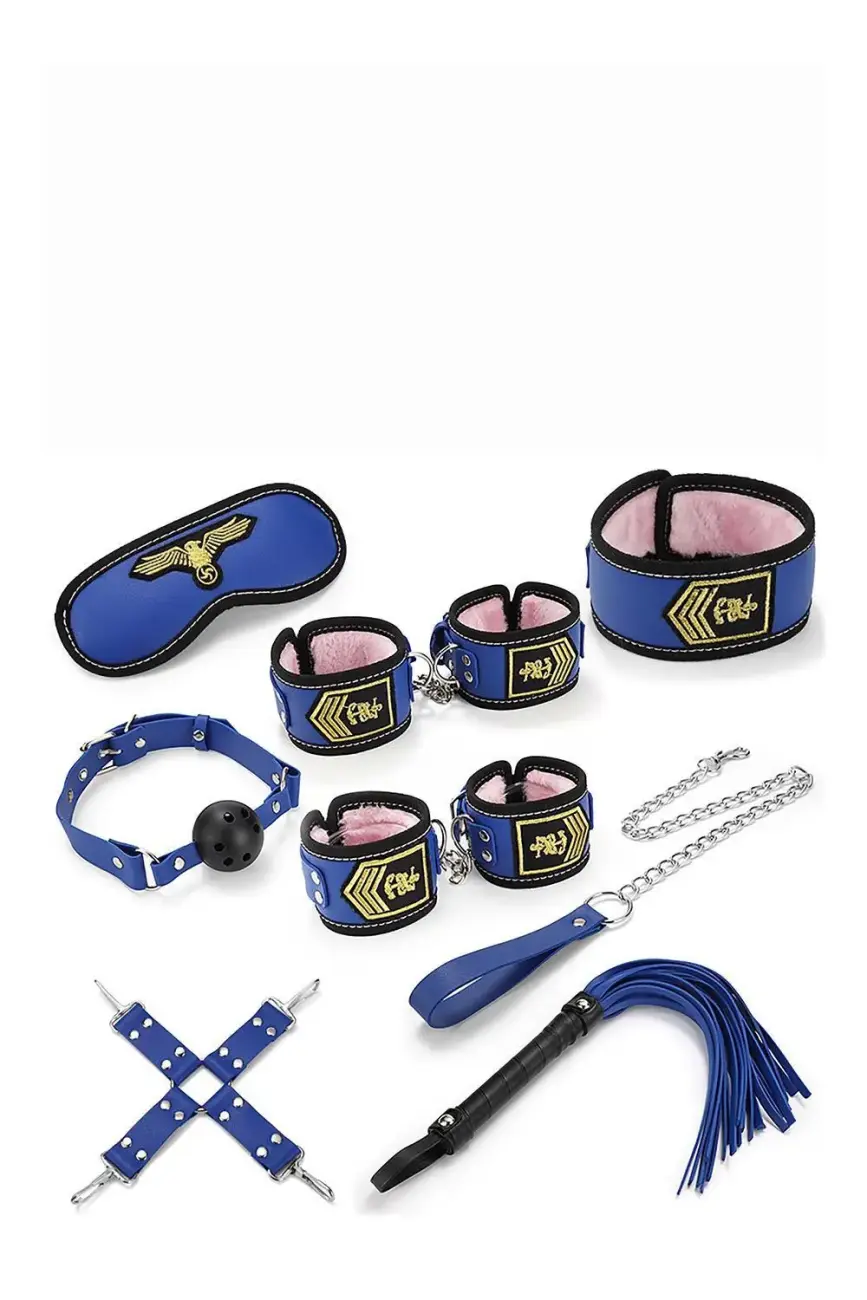 Attraction bondage set "Air Force", containing 8 items:Wrist cuffs: 31 cm long, 6 cm wideAnkle cuffs: 37 cm long, 6 cm wideMask: 29 cm long, 7,5 cm wideHog tie: 26 cm longWhip: 44 cm long, 3,2 cm wideCollar: 45 cm longRope: 62 cm longBall gag: 56 cm longMade of PVC, metal, elastic band, plush, ribbon,plastic and woodWeight 790 grams.