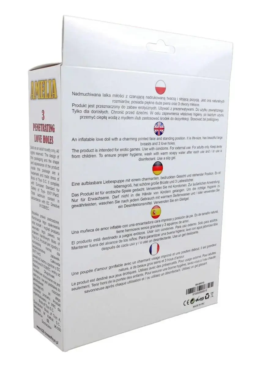 Amelia ir skaista piepūšamā mīlas lelle, kas radīta reālistiskai un aizraujošai pieredzei. Ar savu burvīgo apdrukāto seju un pilna auguma izmēru viņa noteikti valdzinās un iepriecinās.