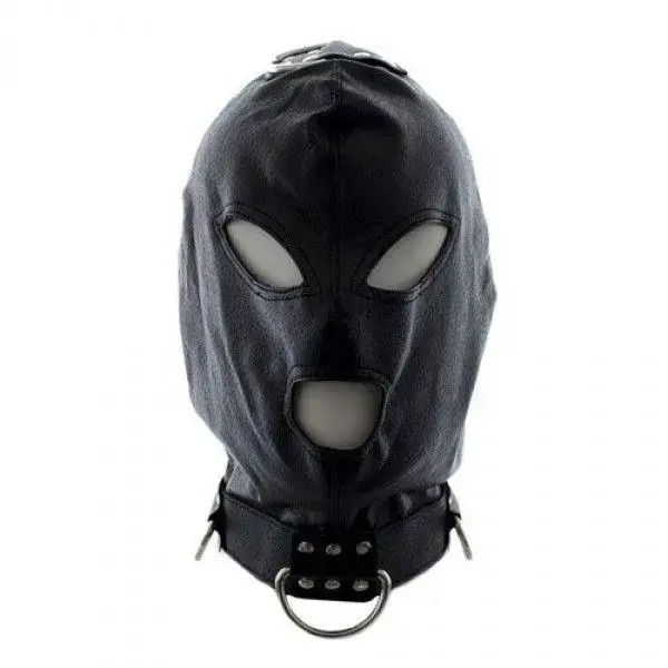 Czarna skórzana maska niewoli, z otworami na oczy i usta oraz kołnierzem z metalowymi pętelkami. Ta wytrzymała skórzana maska jest wykonana tak, aby przetrwać wiele pozostając miękką i wygodną. Jest to przedmiot Toyz4Lovers: aby spełnić twoje ukryte pragnienia!