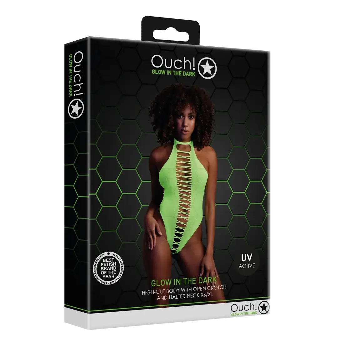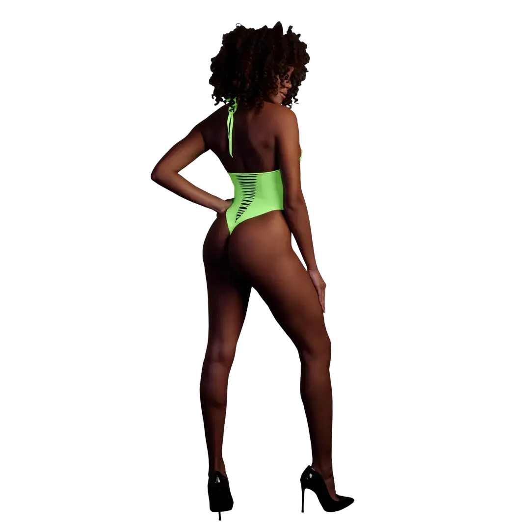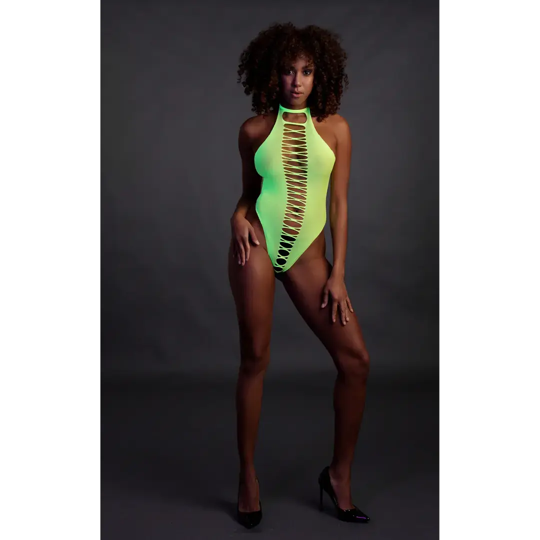 Izcelieties ar šo satriecošo, UV staros mirdzošo bodiju, kas ir ideāli piemērots gan drosmīgiem ballīšu tērpiem, gan kārdinošam vakaram. Tā augstais piegriezums vizuāli pagarina kājas un izceļ vidukli, savukārt atvērtā starpkāja piešķir tēlam rotaļīgu un pikantu akcentu.