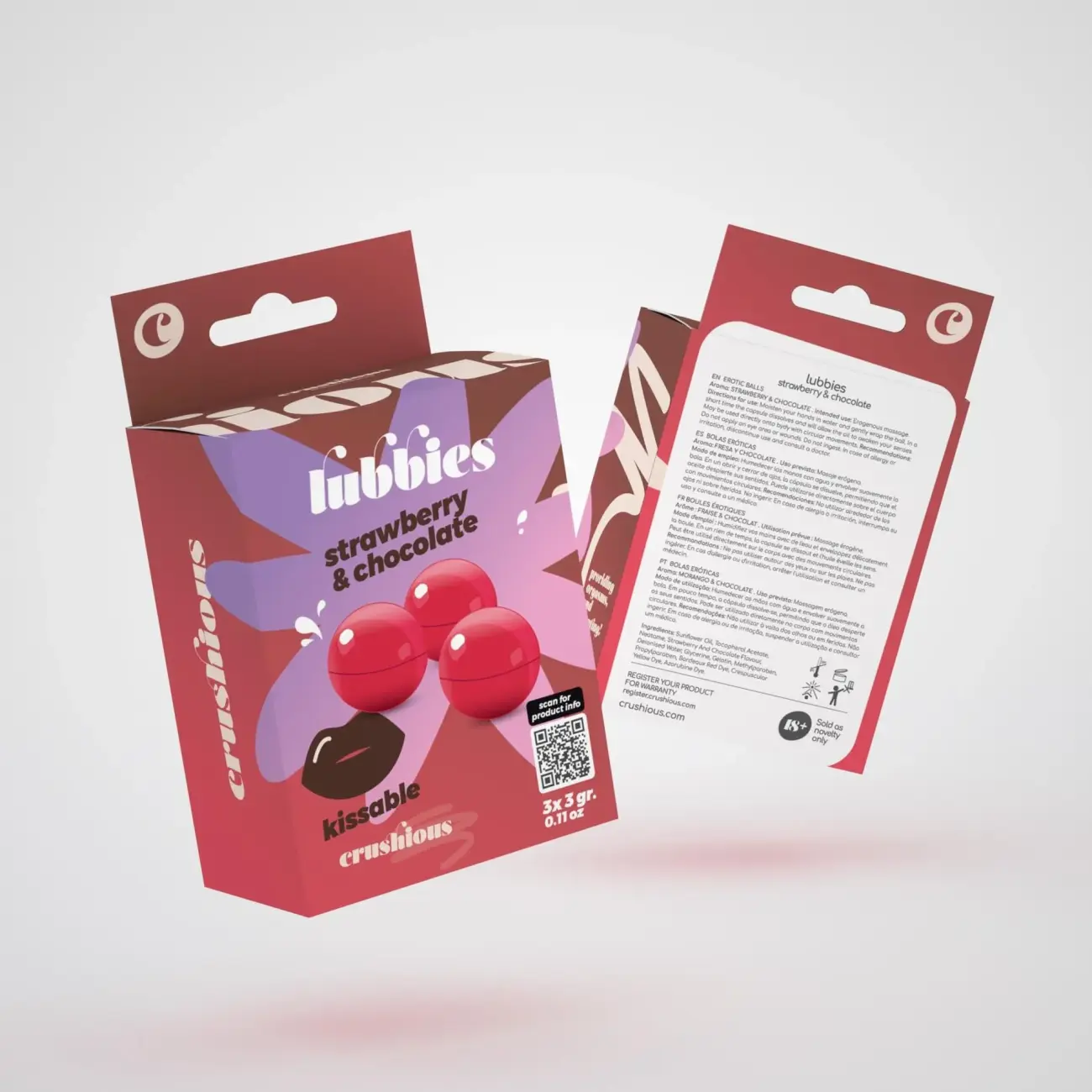 Atklājiet saldu baudas eksploziju ar CRUSHIOUS Lubbies, kas radītas, lai uzkurinātu jūsu sajūtas intīmās priekšspēles laikā. Šīs ēdamās masāžas eļļas bumbiņas kūst no ķermeņa dabiskā siltuma, atbrīvojot gardu zemeņu un šokolādes aromātu, kas ir lieliski piemērots radošām orālām rotaļām.
