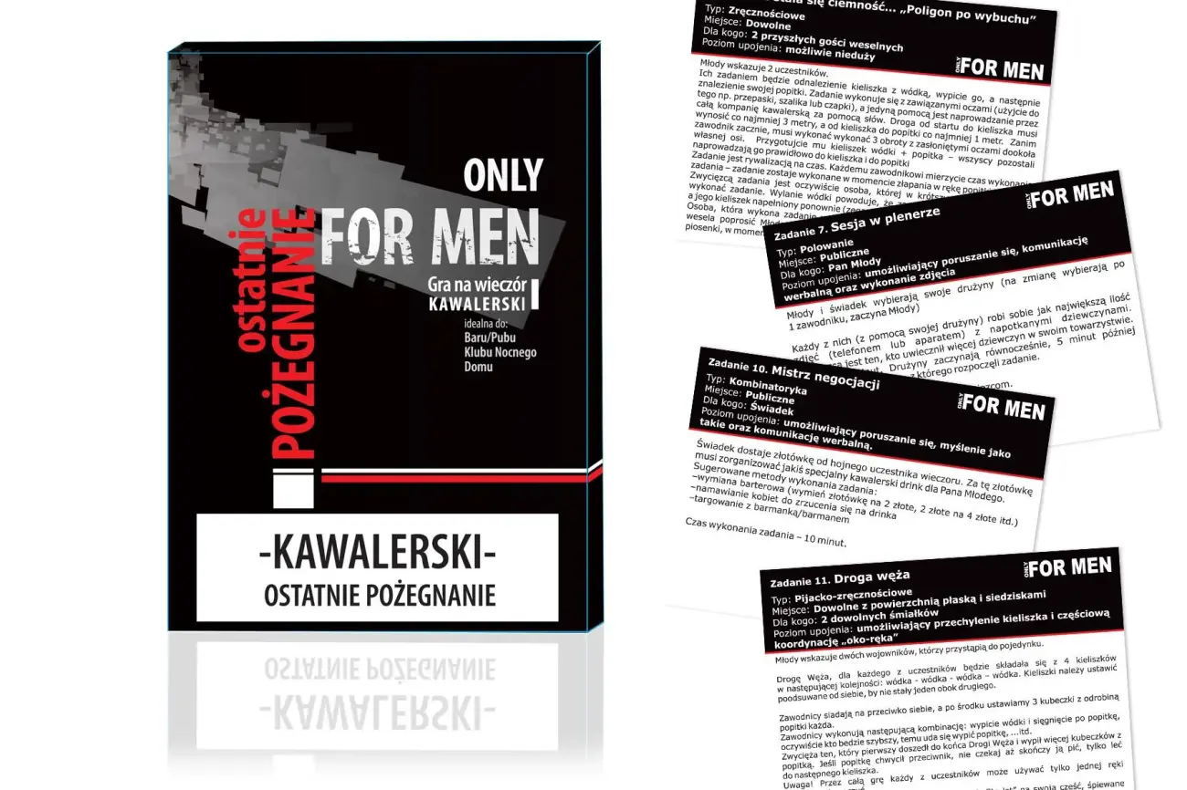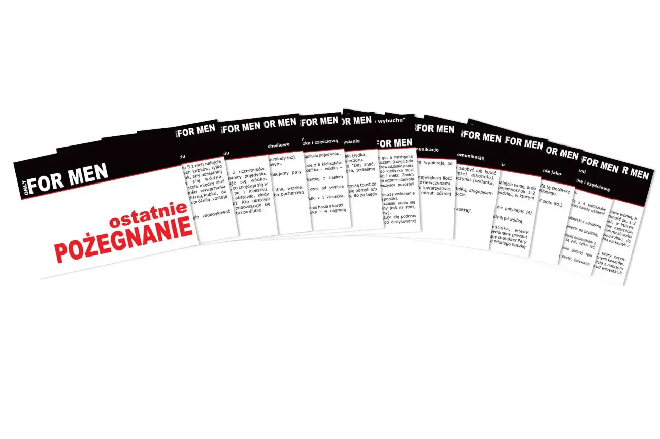 To coś więcej niż gra - to gadżet zamknięty w paczce papierosów, mieści się w kieszeni. A może zastanawiasz się jak namówić męskie stado na taki rodzaj Ostatniego Pożegnania? Gwarantujemy, że wystarczy flaszka, parę kieliszków i otwarta paczka gry.