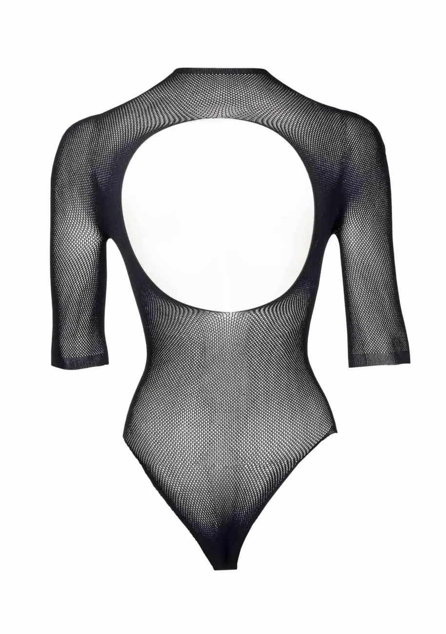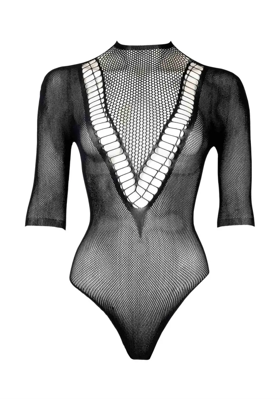 Šis elegants melns bodijs ir izgatavots no augstas kvalitātes materiāliem, nodrošinot komfortu un pievilcīgu izskatu. Tam ir apaļš kakla izgriezums, V-veida izgriezums ar sietiņa audumu, īsas piedurknes un juteklisks izgriezums aizmugurē. Paredzēts izmēriem S-XL, tas piešķirs valdzinošu pievilcību intīmiem vakariem. Lūdzu, ņemiet vērā, ka stringi nav iekļauti komplektā.