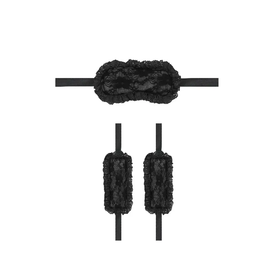 Have you fantasized about a sexy game of submission and dominance? Then this will be the perfect start for you! Make sure your love slave listens to your every instruction while you tease and seduce them. Blindfold and bind their wrists so you have free reign to do anything you want. If you are the submissive type and you want to be the one who's blindfolded and bound, then this will be the perfect gift for your master! Comes with 2 pc lace mask and wrist cuffs.