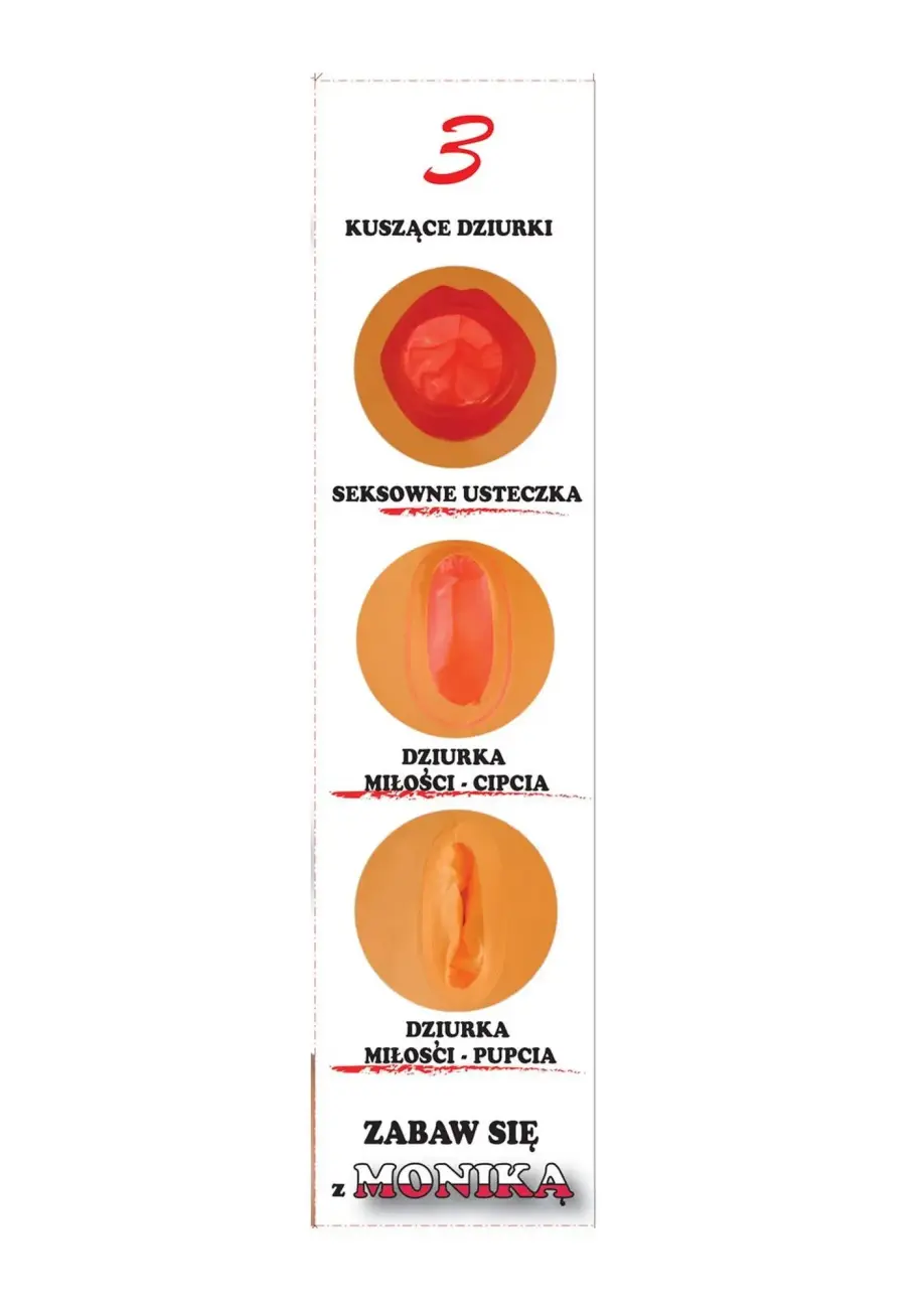 Monika ir skaista piepūšamā mīlas lelle, kas radīta reālistiskai un aizraujošai pieredzei. Ar savu burvīgo apdrukāto seju un dabīgo augumu viņa ir radīta, lai valdzinātu un stimulētu jūsu sajūtas.
