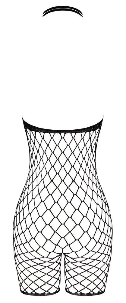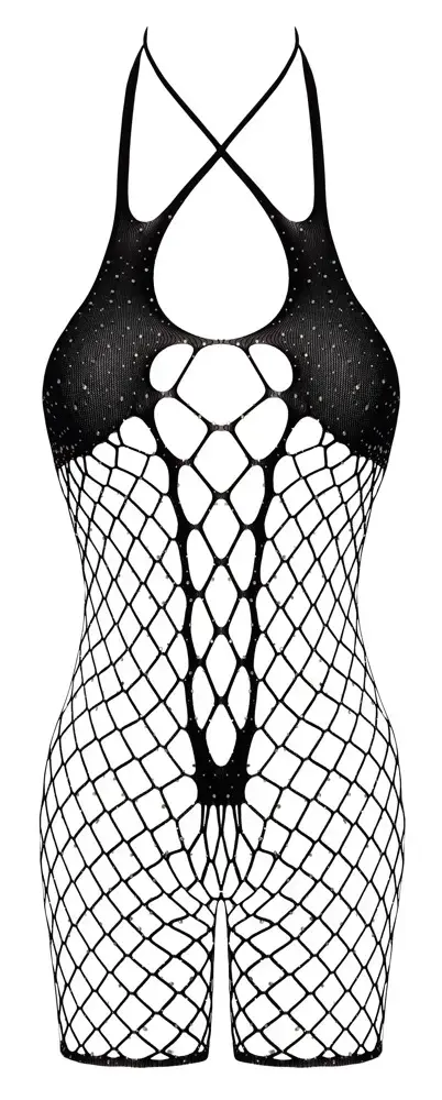 Experience the allure of the Cottelli FANTASY mesh bodysuit, designed to captivate with its intricate design and sparkling accents. This backless and crotchless piece features short legs and is crafted from soft, stretchy black mesh that contours perfectly to your body for a seamless, comfortable fit.