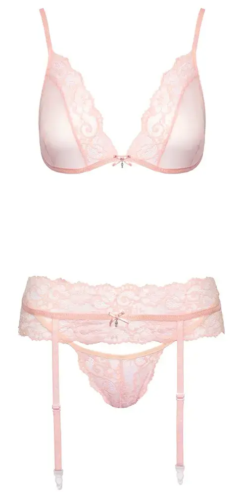 Kogege eksklusiivset stiili sensuaalses ja õrnas roosas toonis. See kissable komplekt sisaldab pehmet rinnahoidjat, sukahoidjat ja stringe, mis on valmistatud peenest tüllist ja õrnadest pitsidest romantilise välimuse loomiseks.