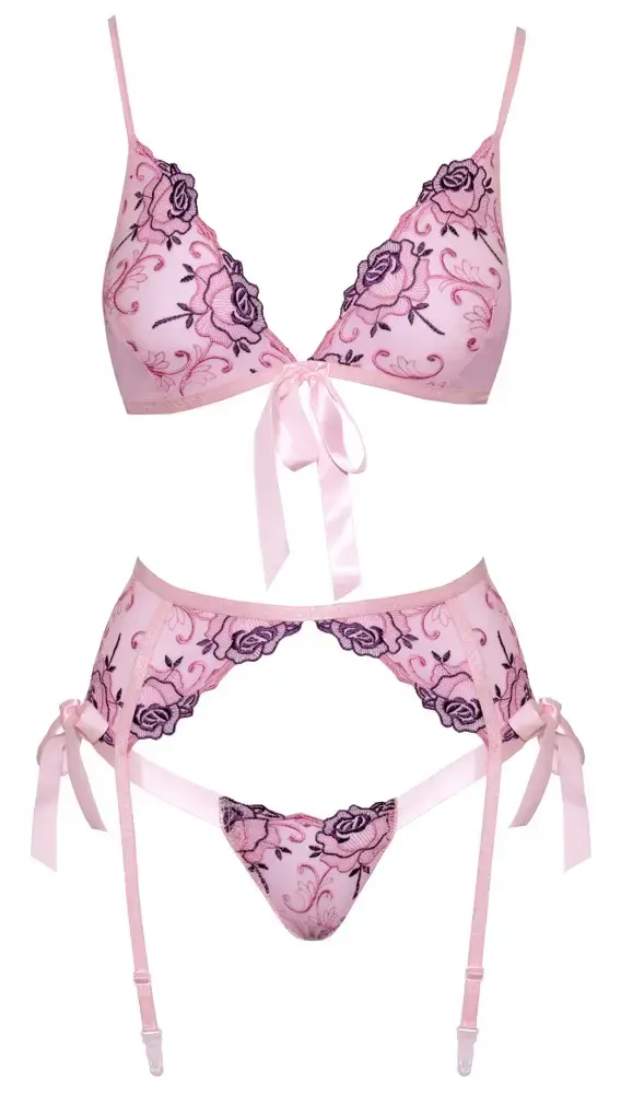 Kogege elegantsi selle eksklusiivse kissable pesukomplektiga, mida kaunistavad õrnad lillelised tikandid ja võluvad lipsukesed. Komplekti kuuluvad tugikaarteta rinnahoidja, sukahoidja ja sobivad stringid, mis on valmistatud pehmest ja venivast materjalist, tagades mugavuse ja kauni istuvuse.