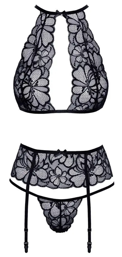 Kogege selle eksklusiivse pesukomplekti elegantsi, mis on valmistatud õrnast lillelisest pitsist. Komplekti kuuluvad tugikaarteta rinnahoidja, sukahoidja ja sobivad stringid, mis on loodud pakkuma pehmet ja mugavat istuvust.