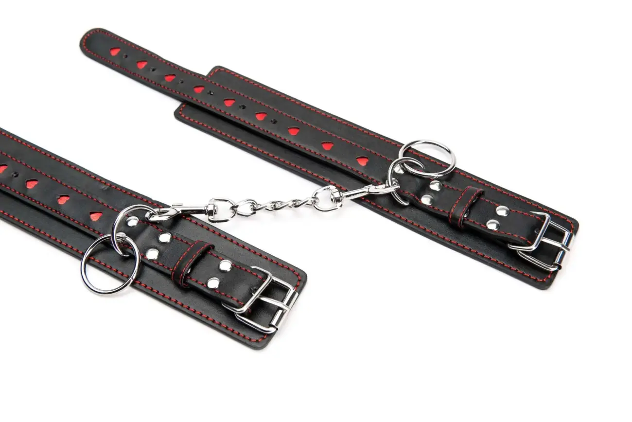 Klasyczne czarne mankiety na kostki z małym twistem w kolorze czerwonym z serduszkami wykonane są ze skóry i bezniklowych okuć. Są bezzapachowe, bardzo trwałe i wystarczająco wytrzymałe do wszelkiego rodzaju zabaw łóżkowych. Połączenie między nimi jest za pomocą dwóch karabińczyków, które można odpiąć i połączyć razem lub z czymś za pomocą linki. Końcówki są zszyte czerwoną nicią, dzięki czemu będą bardzo trwałe. Rozmiar jest idealny dla każdego. Wymiary pudełka to 30x12,5x3,8 cm