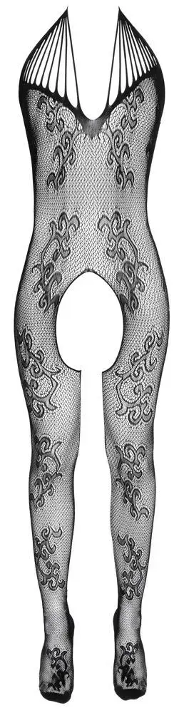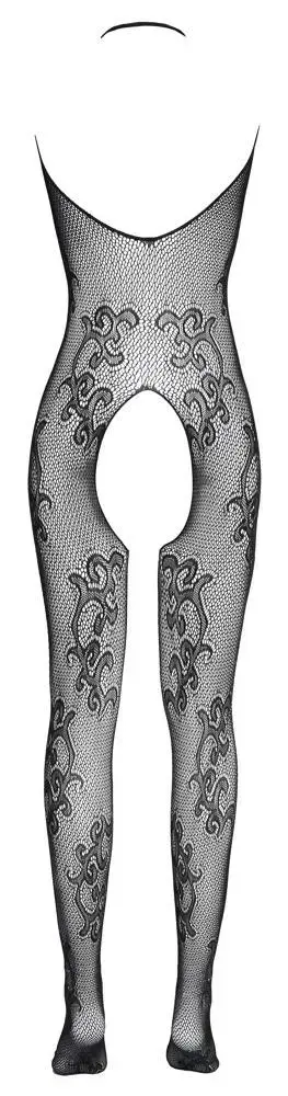 Provocative transparency with a daring opening! This sophisticated catsuit from NO:XQSE is crafted from delicate mesh with intricate ornaments. Elastic straps at the neckline merge into a halterneck, leaving the back excitingly bare. A generous opening in the crotch allows for intimate spontaneity. Seamless, soft, and stretchy for ultimate comfort, complete with integrated feet.