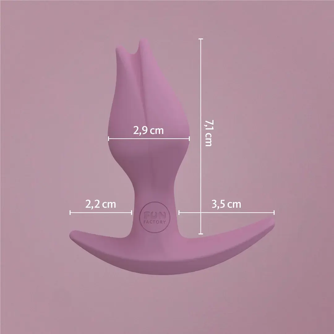 The Bootie Fem butt plug is designed for vulva owners, offering a unique experience for solo or partnered play. Its small size, tapered tip, and velvety silicone material make it ideal for both beginners and experienced users. The asymmetrical base ensures precise positioning for simultaneous vaginal penetration, enhancing pleasure and leading to intense climaxes. The tulip shape symbolizes blooming pleasure, stimulating nerve endings for a more intense orgasm. When worn anally during vaginal penetration, it guides the penis or toy to the G-spot, resulting in a brilliant all-around orgasm enhanced by anal stimulation. The narrow, discreet base feels secure and remains hidden under clothing. Its beginner-friendly size and tapered bud allow for problem-free insertion. For optimal comfort, use plenty of lubricant.