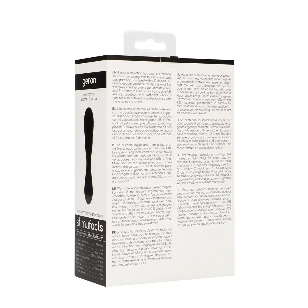 If anal stimulation has your preference, you can't go wrong with this ergonomically designed toy! Equipped with a 10-speed, USB rechargeable vibration mode, the GERON will always be there for your ultimate pleasure! The smooth 100% pure silicone and ABS ensure, together with sufficient lubrication, for a smooth entry and exit, every time the GERON is on call!