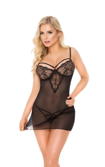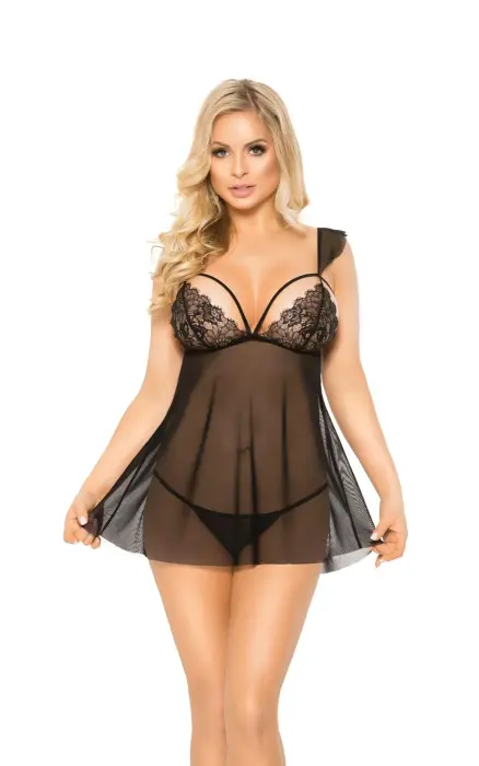 Adela сетчатый комплект babydoll с кружевом и вырезом – чёрный – M/L