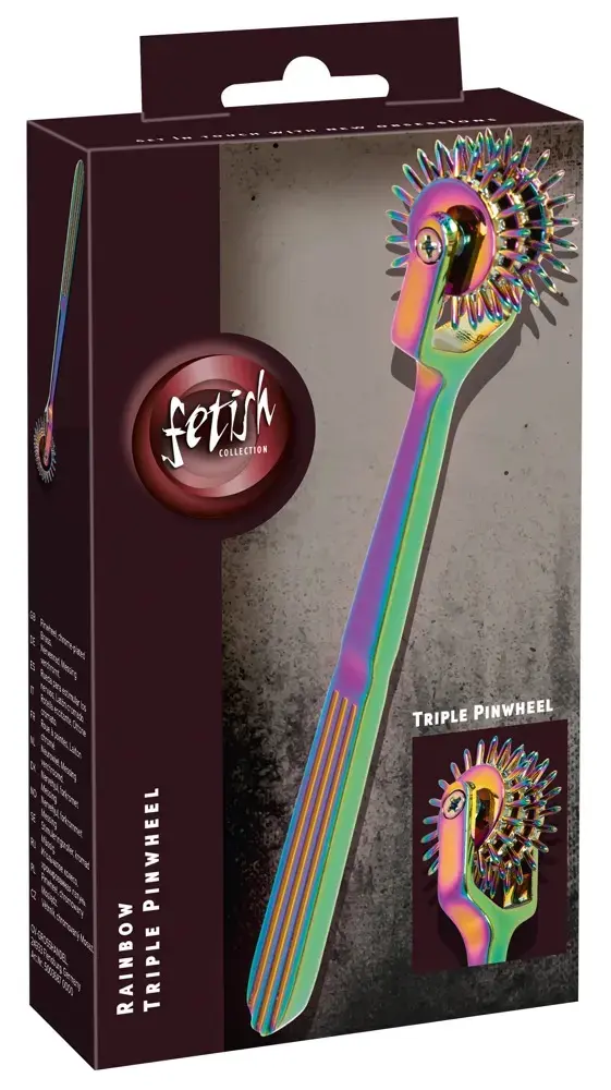 ["Trifft den richtigen Sex-Nerv!\nRobustes Metall-Nervenrad Rainbow Triple Pinwheel von fetish collection in edel schillernden Regenbogenfarben. Es wird mit mehr oder weniger Druck \u00fcber die Haut gerollt und verursacht dabei entweder sanft stimulierende Gef\u00fchle oder intensiven lustvollen Schmerz. Die drei mit kleinen sehr spitzen Nadeln besetzten R\u00e4dchen k\u00f6nnen \u00fcberall am K\u00f6rper zum Einsatz kommen. Der lange schmale Griff liegt dabei gut in der Hand und sorgt f\u00fcr optimale F\u00fchrung und variabel leicht auszu\u00fcbenden Druck.\n\nGesamtl\u00e4nge 18,5 cm, R\u00e4dchen-\u00d8 3 cm, Nadelspitzen 6 mm lang.\nGewicht 89 g.\nMetall.","Hits the right nerve!\nSturdy metal Rainbow Triple Pinwheel from fetish collection in shimmering rainbow colours. It is rolled over the skin with more or less pressure, causing either gently stimulating sensations or intense pleasurable pain. The wheel is studded with small, very sharp pins and can be used anywhere on the body. The long, narrow handle sits comfortably in the hand and ensures optimum guidance and full control over the applied pressure.\n\nTotal length 18.5 cm, wheel \u00d8 3 cm, pins 6 mm long.\nWeight 89 g.\nMetal."]