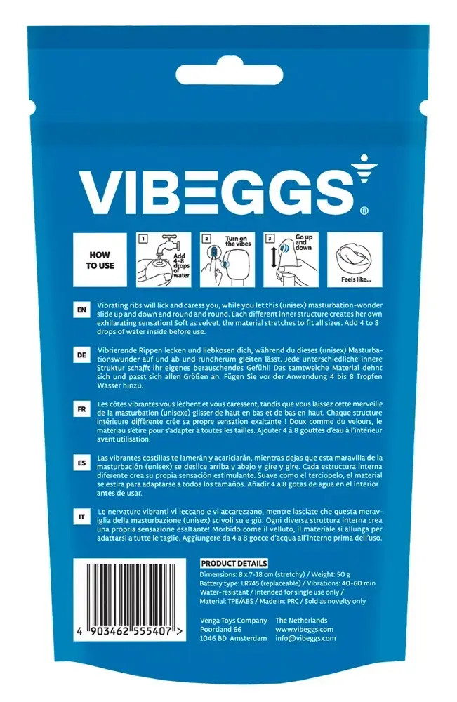 Uniseks rotaļlieta solo un pāru izklaidei! Īpaši elastīgā Vibeggs Blow Misty vibrējošā masturbatora uzmava var tikt izmantota arī kā stimulējoša pirkstu uzmava. Tās aizraujošā tekstūra un intensīvās vibrācijas rievotajā zonā sniedz baudu solo spēlēs vai kopā ar partneri. Šis mazais, bet jaudīgais rīks neprasa smērvielu, jo to viegli var samitrināt ar ūdeni vai siekalām, lai nodrošinātu maigu baudu.