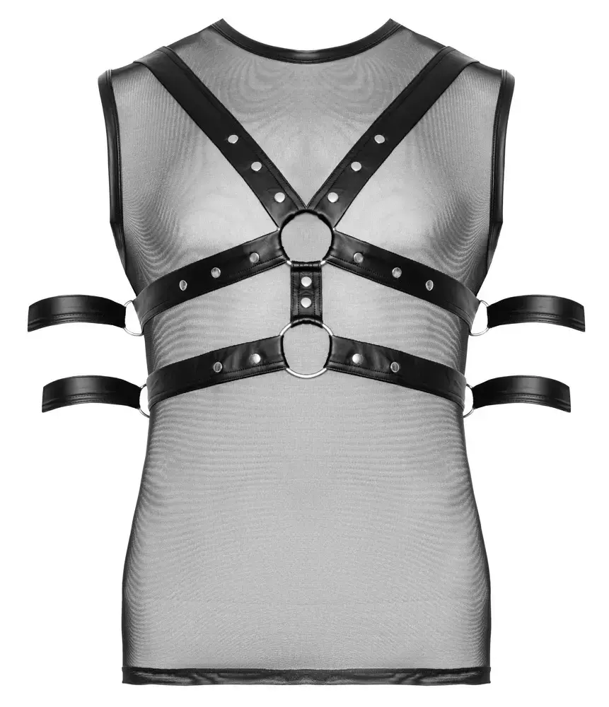 Krekls ir izgatavots no smalka powernet materiāla priekšpusē un gludas matētas apdares aizmugurē, nodrošinot gan pārsteidzošu izskatu, gan ērtu, elastīgu piegulšanu. Ar regulējamām siksnām, spiedpogām un integrētiem gredzeniem šis komplekts piedāvā daudzpusību un lietošanas ērtumu jūsu intīmajos brīžos.