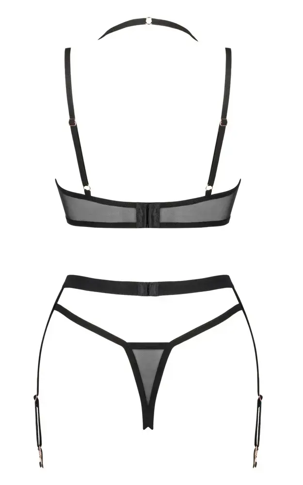 Izbaudiet puristisko eleganci ar Obsessive Selinne komplektu. Šis izsmalcinātais 3 daļu komplekts ietver krūšturi ar stīpiņām, zeķturi un stringus, kas izgatavoti no mīksta, elastīga tīkliņa un mikrofibras. Krūšturim ir paketes ar kontrastējošām rozā stīpiņām. Aizmugurējā aizdare, kā arī kakla un plecu lencītes ir regulējamas, lai nodrošinātu perfektu piegriezumu. Zeķturim ir arī aizmugurējā aizdare un klipši katrā pusē. Ideāli piemērots intīmiem vakariem un īpašiem gadījumiem, šis komplekts sola gan komfortu, gan valdzinošu stilu.