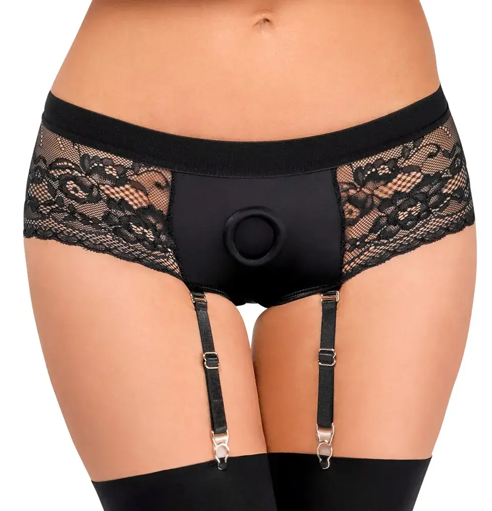 Elegant, comfortable style for thrilling moments! Black strap-on panties from Bad Kitty in a soft, elastic material mix of microfibre and lace. Double-layered at the front with an insert and a carefully incorporated stretchable ring (Ø 3.5 cm) for inserting a dildo/vibrator with a suction base. An inviting cut-out above the bottom. The suspenders are adjustable and also completely removable. 90% polyester, 10% spandex; lace 90% polyamide, 10% spandex. Dildo/vibrator and stockings not included.
