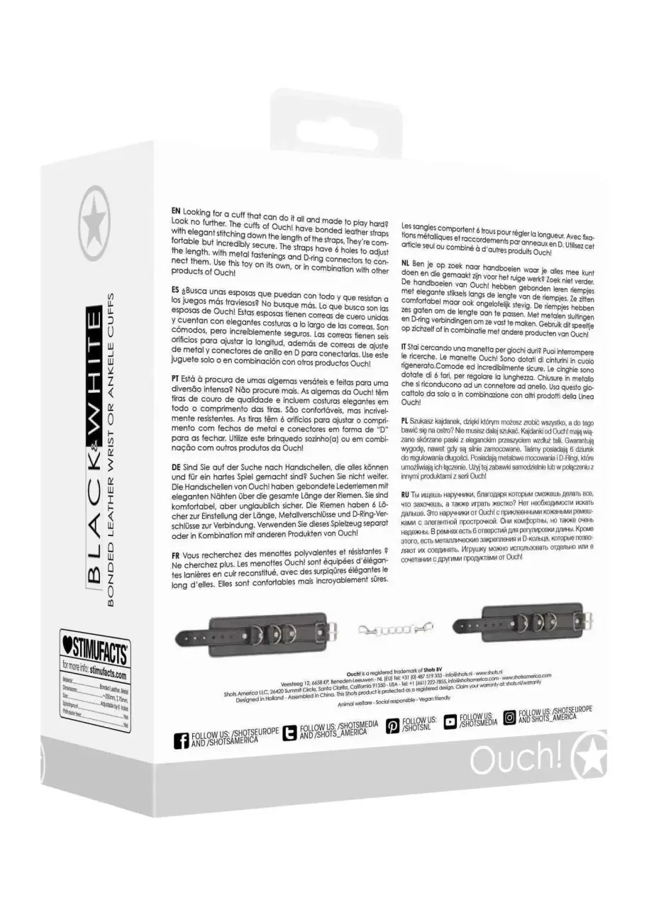 Szukasz kajdanek, dzięki którym możesz zrobić wszystko, a do tego bawić się na ostro? Nie musisz dalej szukać. Kajdanki od Ouch! mają skórzane taśmy z eleganckimi przeszyciami wzdłuż paska. Gwarantują wygodę, nawet gdy są silnie zamocowane. Taśmy posiadają 6 dziurek do regulowania długości. Posiadają metalowe mocowania i D-Ringi, które umożliwiają ich łączenie. Użyj tej zabawki samodzielnie lub w połączeniu z innymi produktami z serii Ouch!