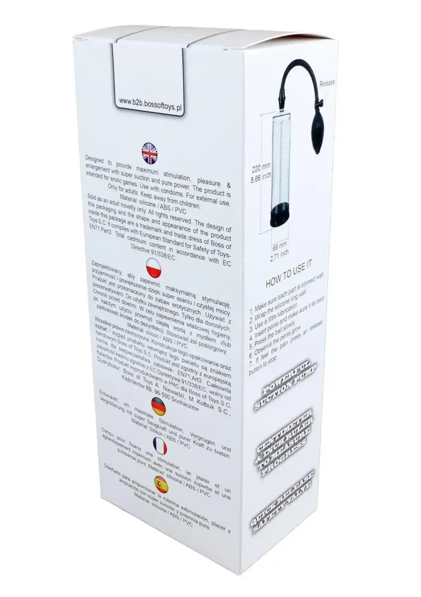 Šī lietotājam draudzīgā palielinošā pumpa var palīdzēt jūsu loceklim palielināties gan garumā, gan diametrā dažu nedēļu laikā. Tās darbība ir vienkārša un balstīta uz fizikas likumiem – ievietojot locekli iekšā, sūknēšana rada vakuums, kas veicina asins pieplūdi. Tas padarīs jūsu locekli daudz jutīgāku pret jebkuru pieskārienu, ļaus izjust vairāk baudas un, līdz ar to, sasniegt tādu orgasmu, kādu vēl nekad iepriekš neesat piedzīvojis.