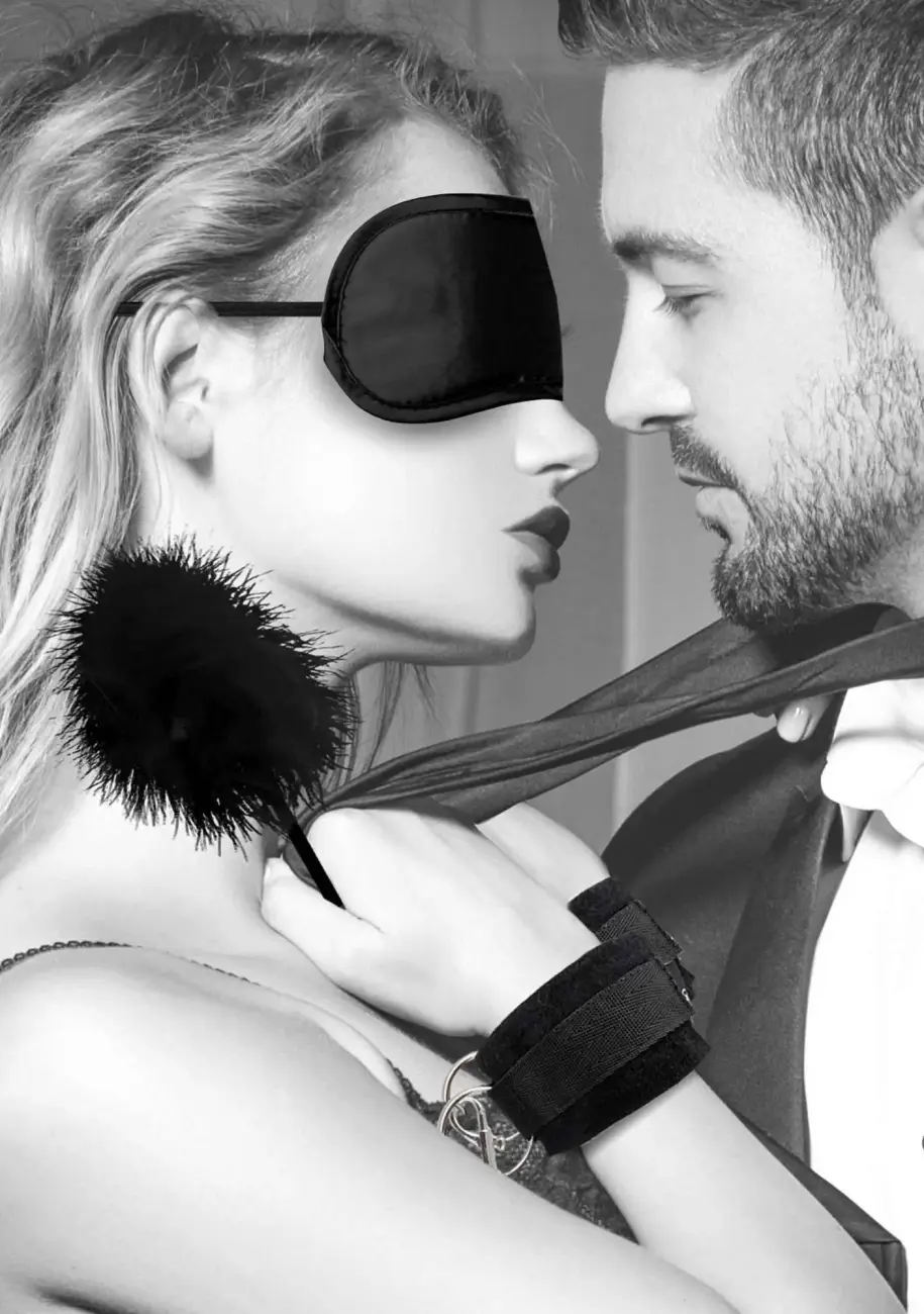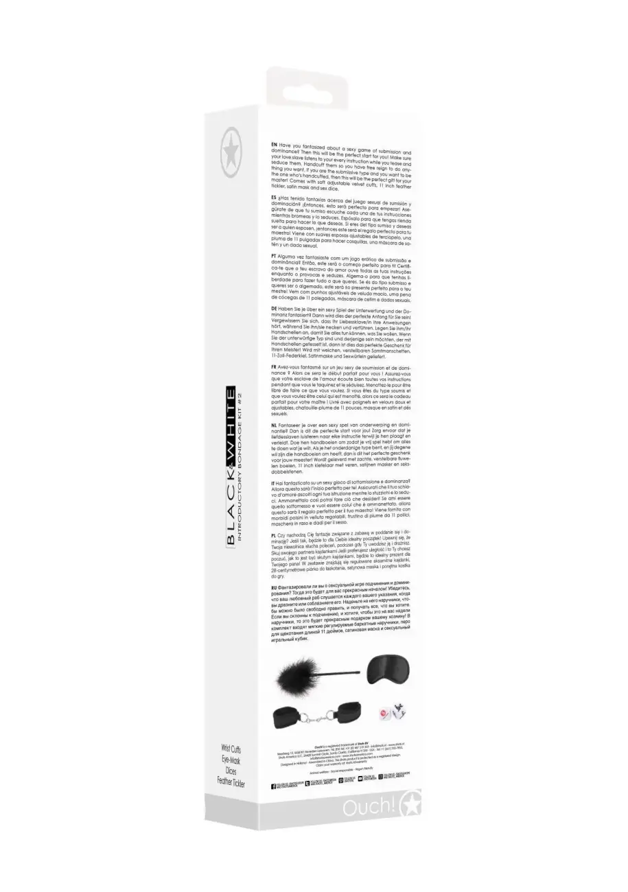 W zestawie znajdują się regulowane aksamitne kajdanki, 28-centymetrowe piórko do łaskotania, satynowa maska i ponętna kostka do gry.