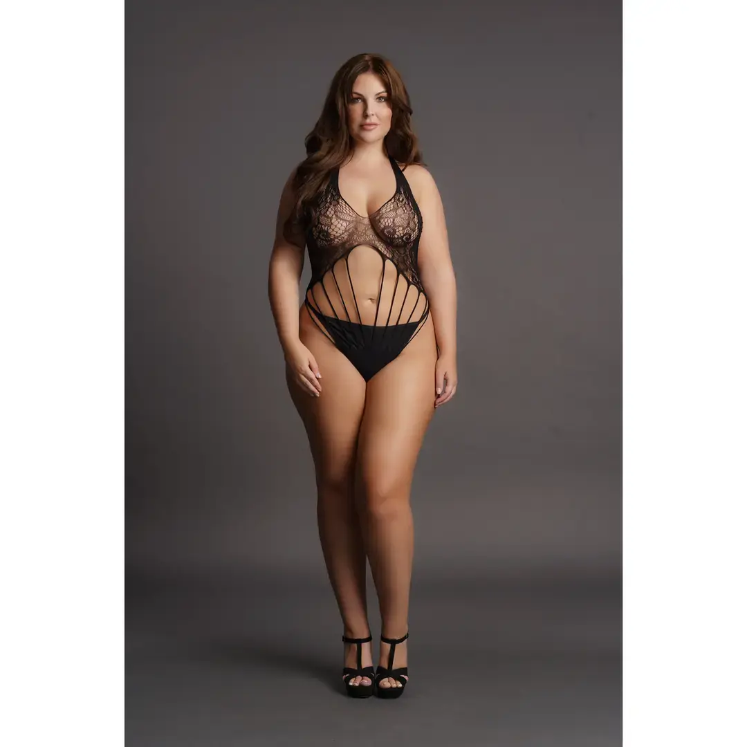 Mežģīņu bodijs ar lencītēm – Plus size – melns
