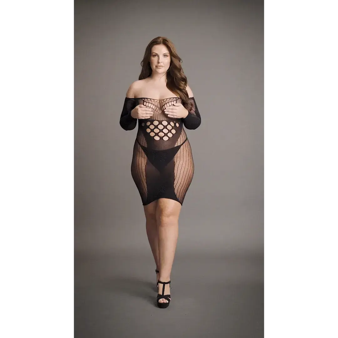 Šī mini kleita ar garām piedurknēm ir izgatavota no pievilcīga kontrastējoša tīkliņa auduma, radot valdzinošu izskatu. Dizains ietver pievilcīgas 'O' formas izgriezumus zem krūtīm un kontrastējošu necaurspīdīgu akcentu, kas skaisti izceļ ķermeņa siluetu. Izstrādāta komfortam un elastībai, šī kleita ir nedaudz staipīga un piemērota izmēriem no XXL līdz 5XL.