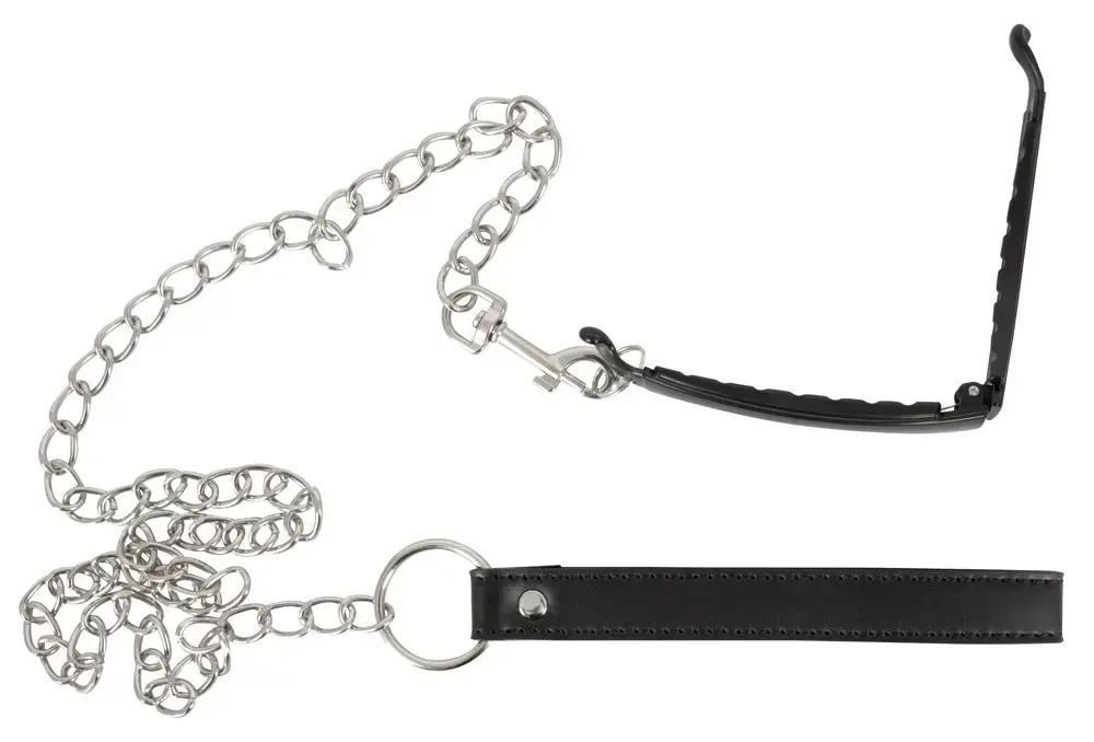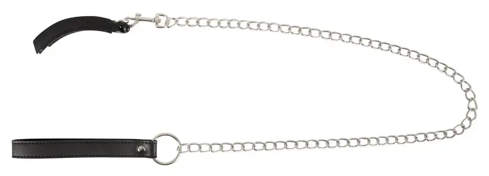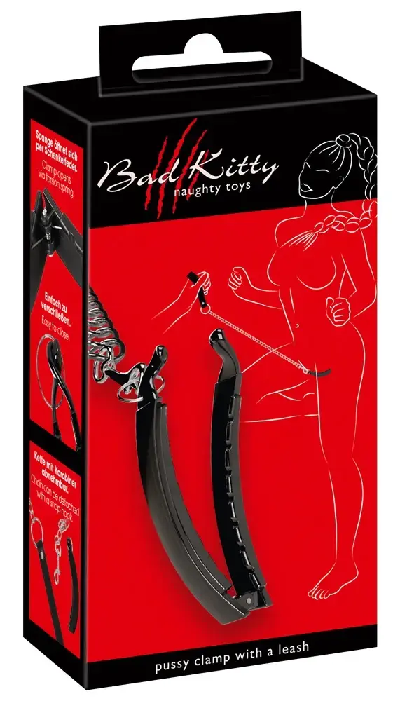 For exciting power games! The Pussy Clamp with a leash from Bad Kitty combines a sophisticated labia clamp with a chain leash. The anatomically ideal curved clamp opens by means of a leg spring and is simply clipped shut after being put on around the labia. The long chain leash with a wrist strap made of imitation leather can be detached from the ring on the clamp thanks to the snap hook. Clamp: 11 cm long, 1.7 cm wide. Leash: total length 85.5 cm, wrist strap 16.4 cm. ABS, metal, PU.