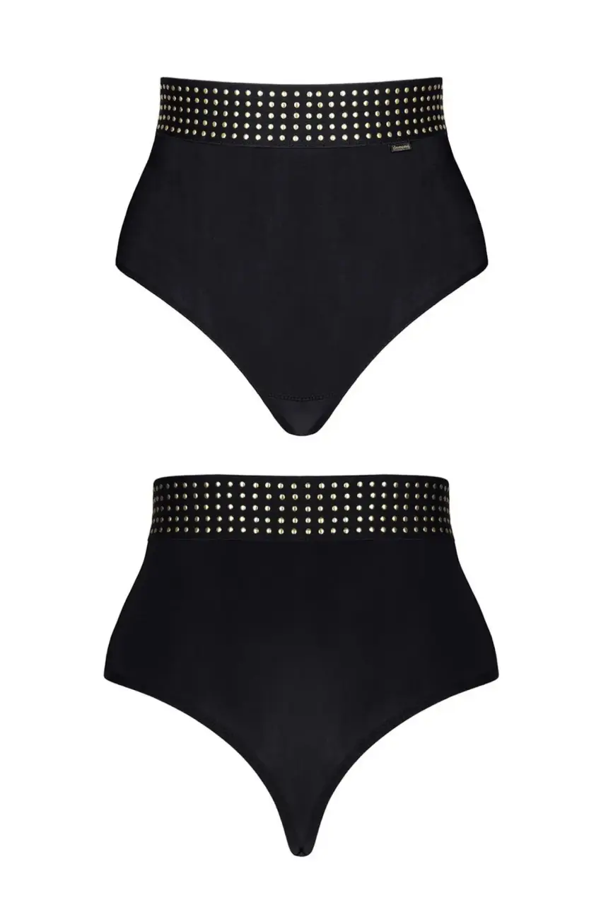 Kõrgema vöökohaga püksikud, mis on täielikult valmistatud väga meeldivast ja elastseks materjalist. Tänu nendele omadustele püksikud sobivad suurepäraselt kehaga, kaunilt rõhutades selle kuju. Eriti sensuaalselt näevad nad välja tagant, kus seksikalt rõhutavad tuharate kurve. Ülemises osas on lai, must kummipael, millel on kaunistused väikeste, kuldsete ringide kujul.