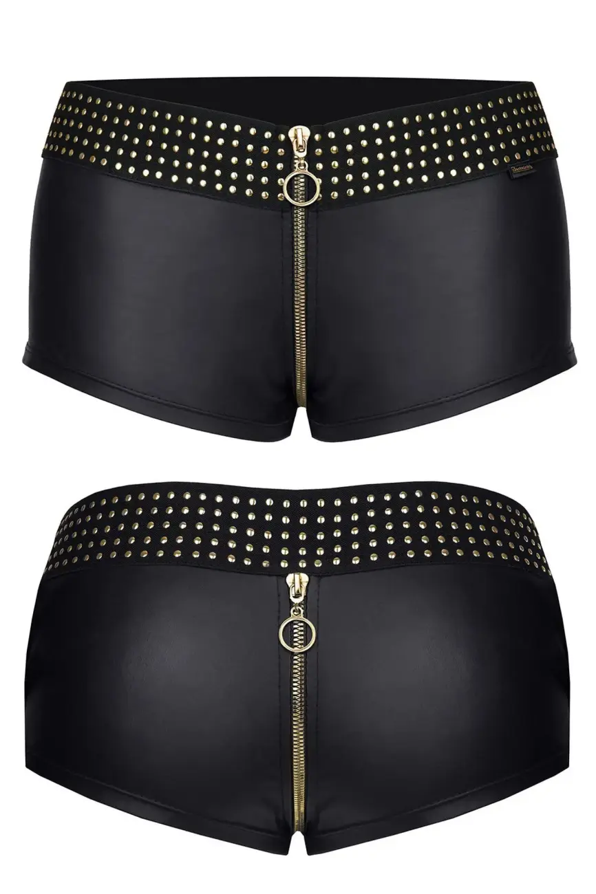Põnevalt sensuaalsed lühikesed püksid, mis on valmistatud vastupidavast ja elastikust wetlook materjalist, mis suurepäraselt ümbritseb keha, sensuaalselt rõhutades selle kuju. Tagaosa on profileeritud nii, et see seksikalt rõhutaks tuharate kurve. Lai must elastne vöökoht sisaldab väikeste kuldsete rõngaste dekoratiivseid aplikatsioone.