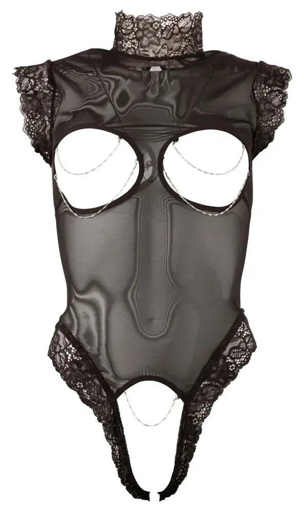 Experience an alluring look with this transparent lace bodysuit, designed to highlight your silhouette. Featuring delicate lace trimmings on the sleeves, collar, and leg openings, this piece offers a sophisticated yet provocative style. The open breast and crotch design, accented with detachable chains, adds a bold touch to your intimate collection.