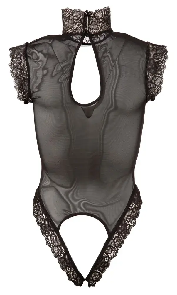 Experience ultimate allure with this transparent mesh bodysuit, designed to highlight your curves with sophisticated details. The piece features delicate lace trimmings on the sleeves, collar, and leg openings, adding a touch of elegance to the provocative design.