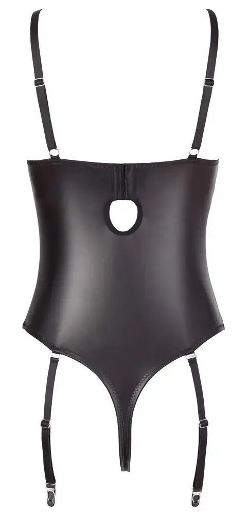 The design includes adjustable, detachable suspender straps and a lightly padded shelf bra for a flattering silhouette. With its open crotch and sparkling rhinestone accents, this bodysuit combines comfort with an unforgettable, daring style.