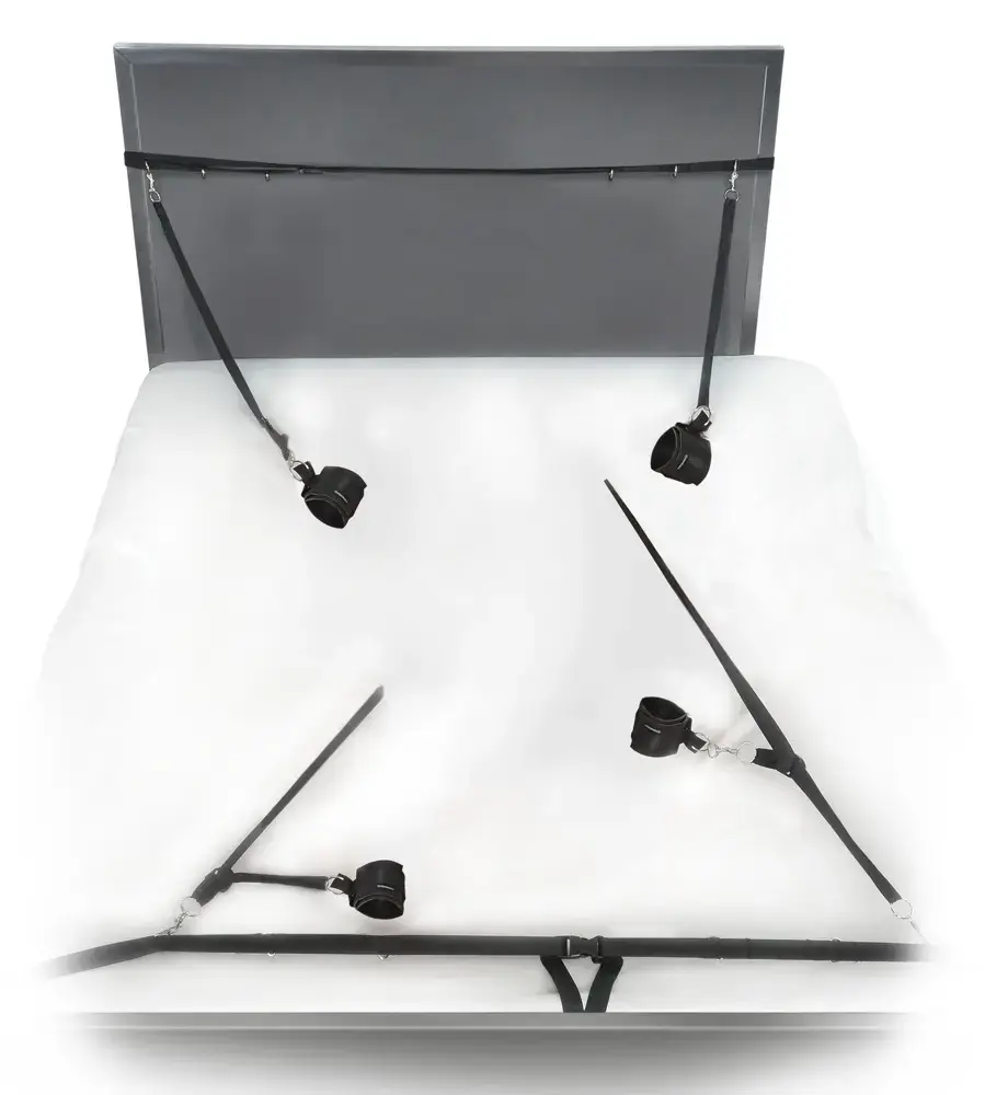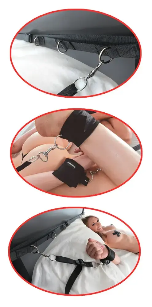 Turns any bed into a bondage playground! Any bed or sofa bed can be turned into a professional bondage playground with this bed restraint set, whether it's at home or on a weekend away somewhere. The adjustable, tear-proof straps fit any mattress – one strap goes at the top of the bed and one strap goes at the foot of the bed. The handcuffs and ankle cuffs can be attached to the D-rings with snap hooks - there are 6 D-rings to choose from. The comfortable handcuffs and ankle cuffs have practical hook and loop fasteners so that they'll fit HIM and HER. ABS, metal, chloroprene rubber, polyamide.