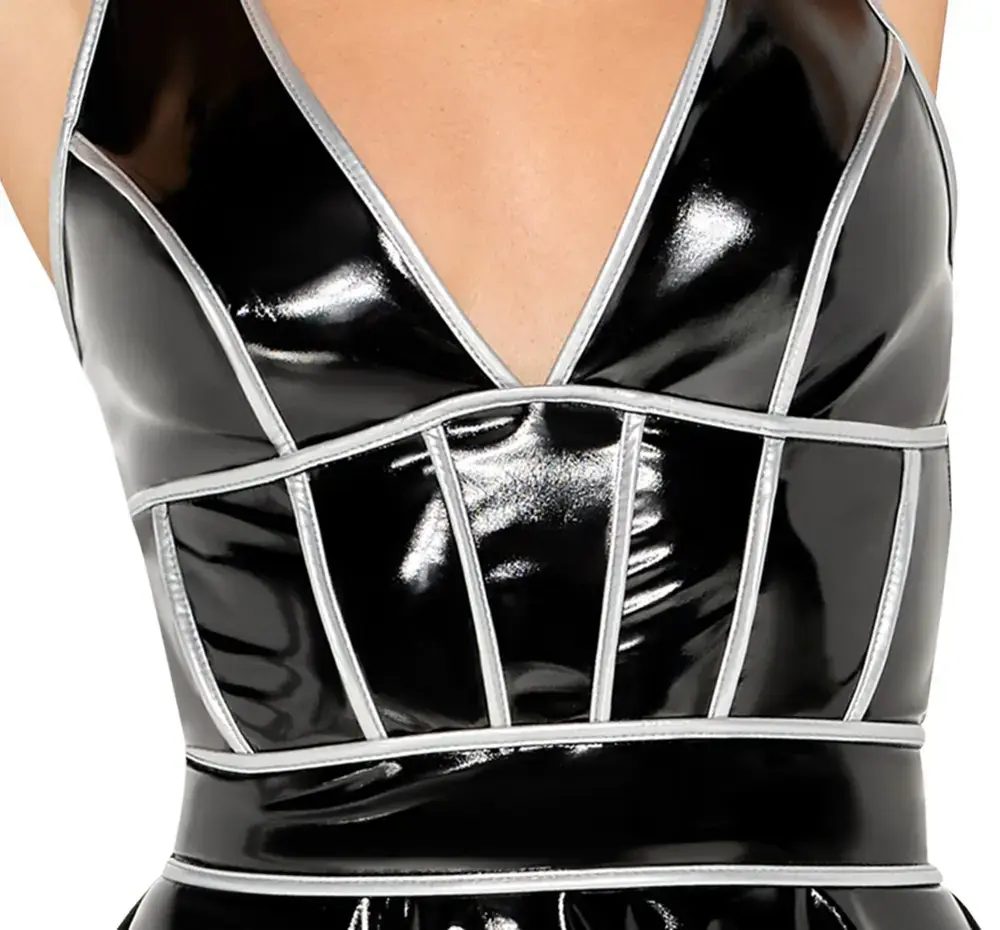 Idealiai tinka ypatingam vakarui ar drąsiam renginiui, ši suknelė siūlo unikalią aštraus stiliaus ir moteriško žavesio kombinaciją. Aukštos kokybės vinilo medžiaga užtikrina glotnų, prigludusį prigludimą, o sidabrinės siūlės suteikia žavesio.