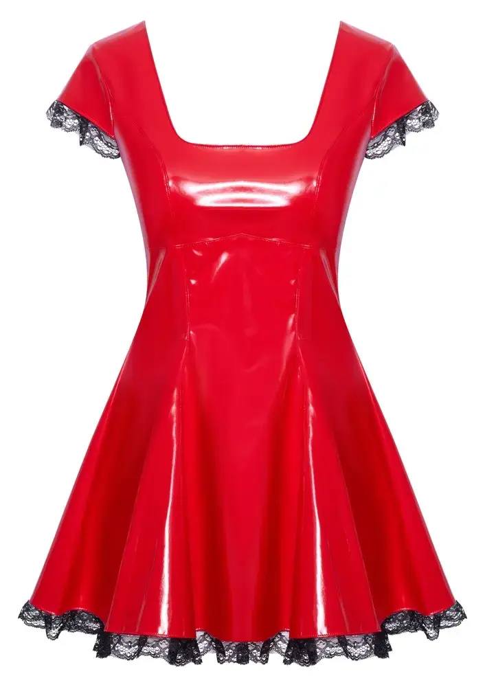 Ši viliojanti mini suknelė iš Black Level yra pagaminta iš blizgaus raudono vinilo, suteikiančio patrauklią išvaizdą. Ji yra prigludusio dizaino su platėjančiu sijonu, seksualia kvadratine iškirpte ir gražiu apvaliu iškirpimu nugaroje. Trumpos rankovės ir apačia puošia juodi raukiniai nėriniai, o užsegama spaudėmis ir užtrauktuku, kad būtų patikimai prigludusi.