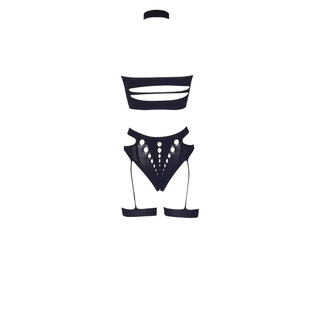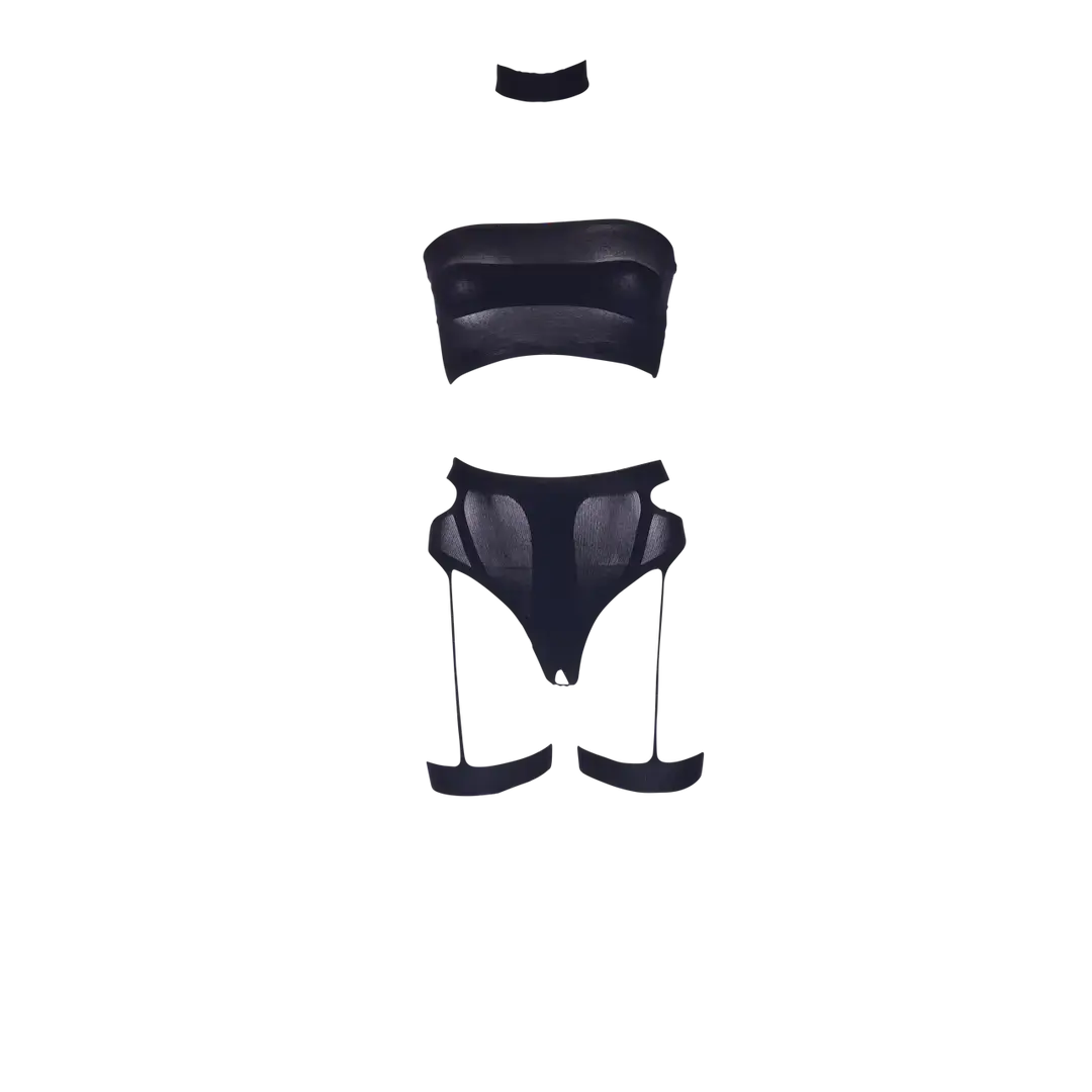 Ananke XII - Trijų dalių komplektas su chokeri, bandeau viršumi ir kelnaitėmis su kojinių laikikliais - Vienas dydis