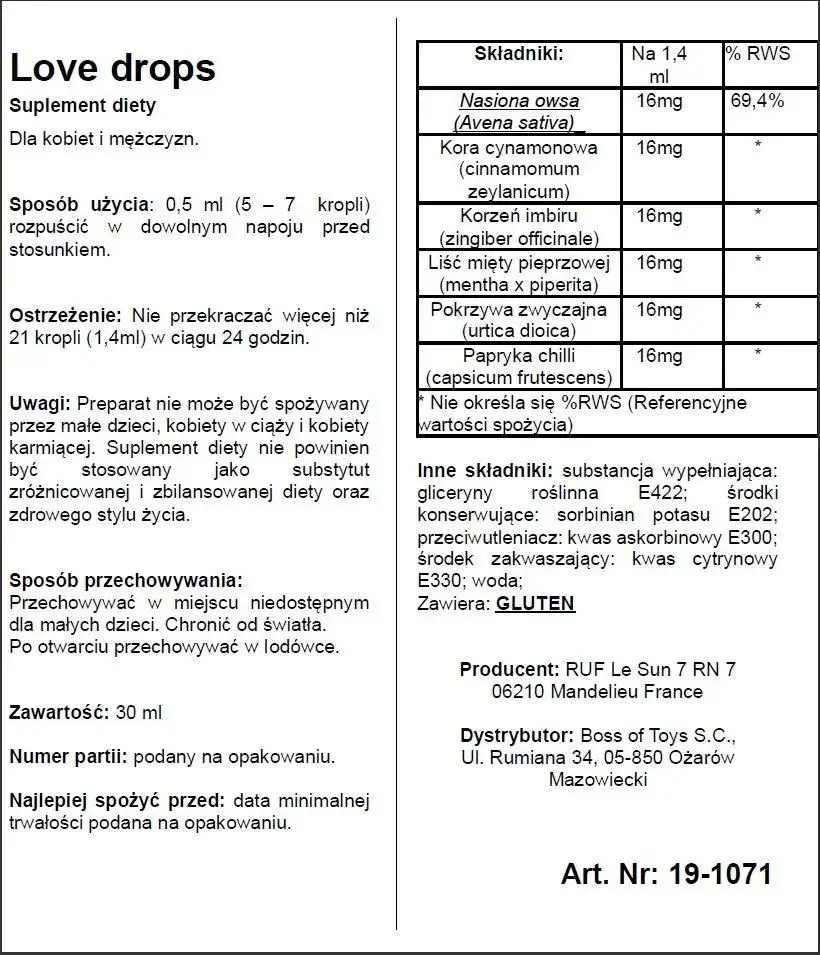 Love Drops — это мощный и эффективный афродизиак в каплях, предназначенный для стимуляции сексуального влечения как у женщин, так и у мужчин. Эта передовая формула повышает чувствительность к сексуальным стимулам, усиливает удовольствие и делает оргазмы более яркими, позволяя вам наслаждаться более насыщенной интимной жизнью.