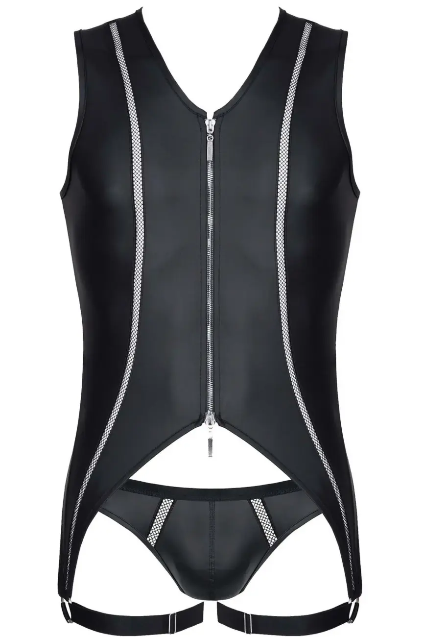 Этот эффектный комплект включает боди из материала wet look с привлекательными сетчатыми вставками по бокам и смелой открытой спиной, которая красиво демонстрирует ягодицы. Боди дополняют подходящие трусы в стиле джокстрап, выполненные с декоративными сетчатыми вставками и удобным, блестящим эластичным поясом. Обе части созданы для того, чтобы подчеркнуть ваши изгибы, с ремешками, предназначенными для акцентирования формы обнаженных ягодиц. Боди имеет двустороннюю молнию для регулируемого стиля и регулируемые металлические регуляторы на эластичных ремешках для идеальной посадки.