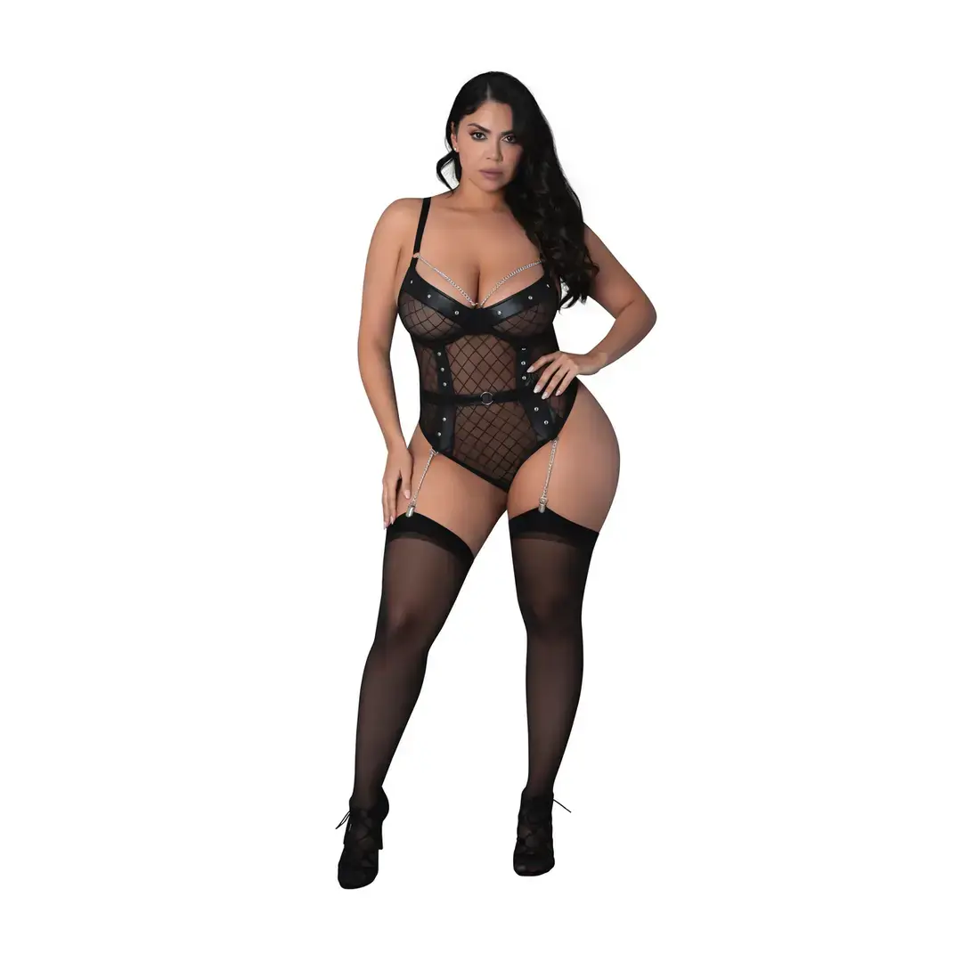 Phoenix боди с бриллиантовой сеткой, подвязками, цепями, кольцами и шипами – чёрное – 2XL